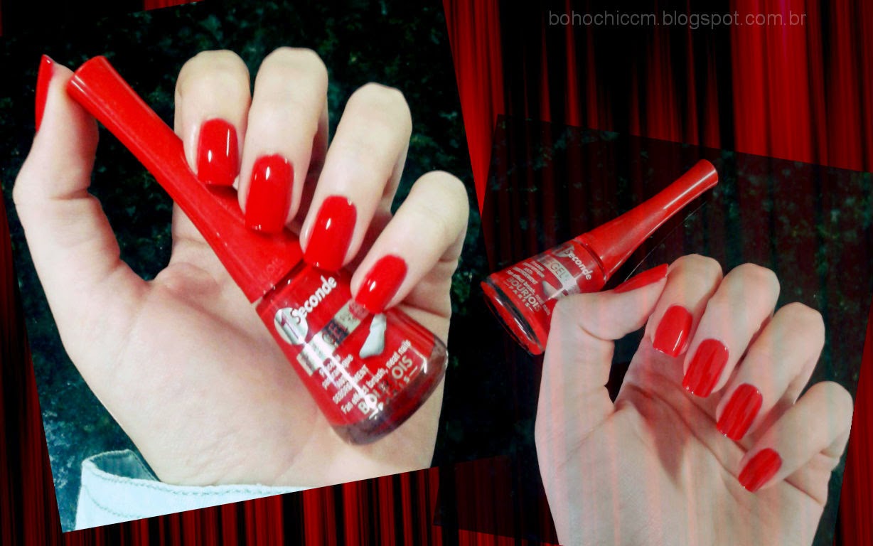 O esmalte de hoje é um Bourjois, chamado Rouge in Style. Na embalagem vem escrito que o pincel é de cerdas de gel e que seca em 1 segundo! UAU! Lá fui eu testar, né? Ele cobre toda a unha com apenas UMA camada e tem o pincel bem achatadinho, o que faz com que a esmaltação fiquei muito fácil! De verdade, esmaltei muito rápido. Em relação ao tempo de secagem, já não senti muita diferença. De qualquer forma, passei meu amado top coat da Impala que resolve qualquer problema! (clique na imagem para ampliar)